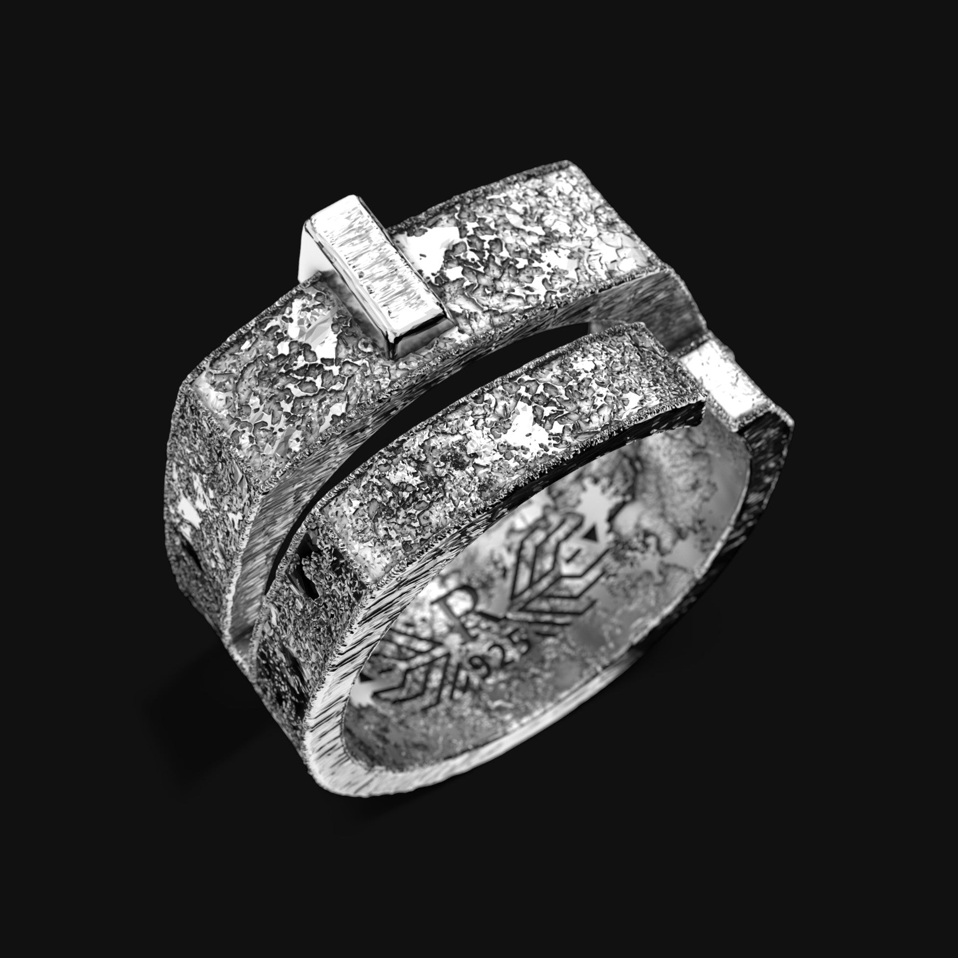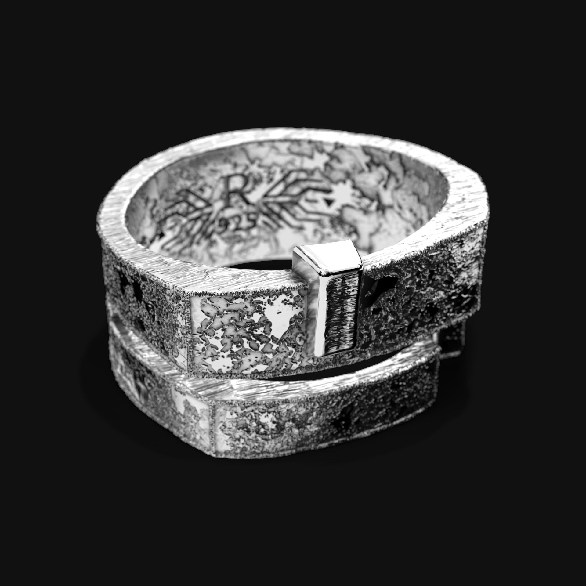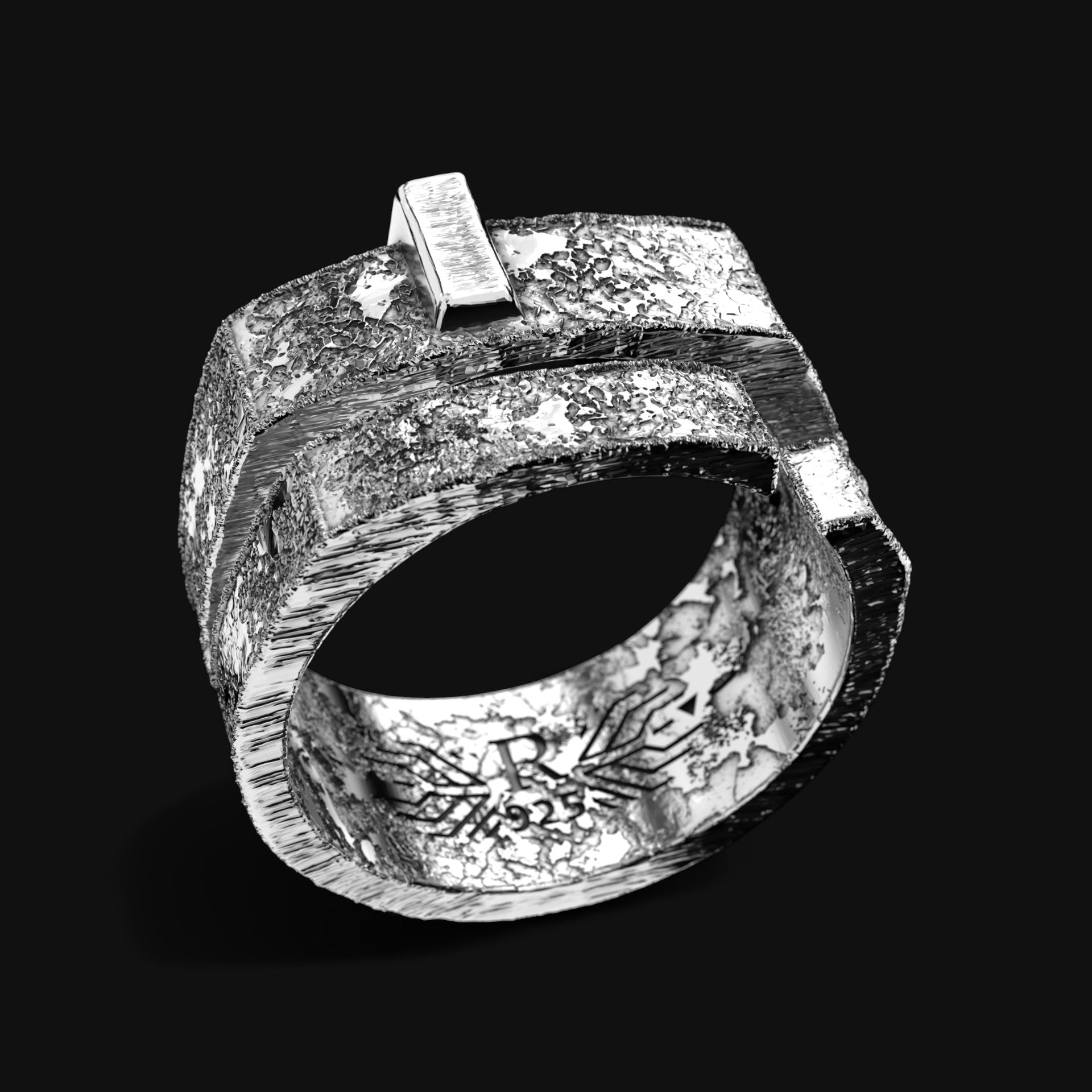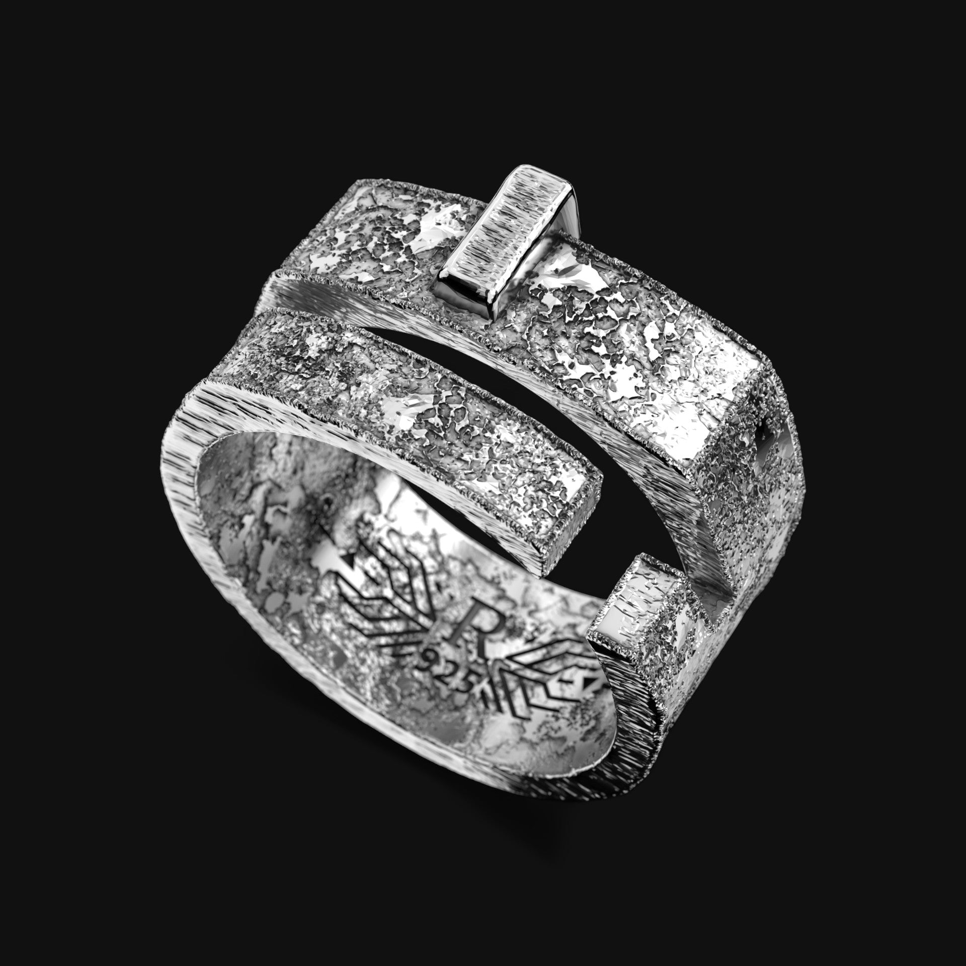 A vow cast in silver, riven yet whole. It carries the calm weight of one who keeps a line when the world shifts. Kept in silence, proven in wear. Pressure settles into quiet strength; years set the promise deeper. A still centre remains.
