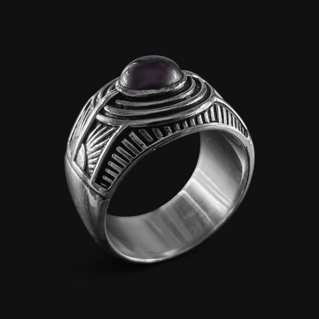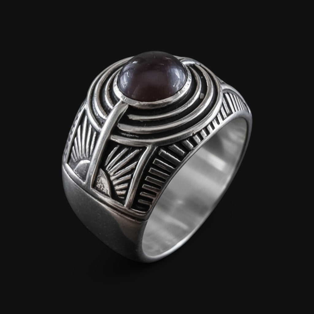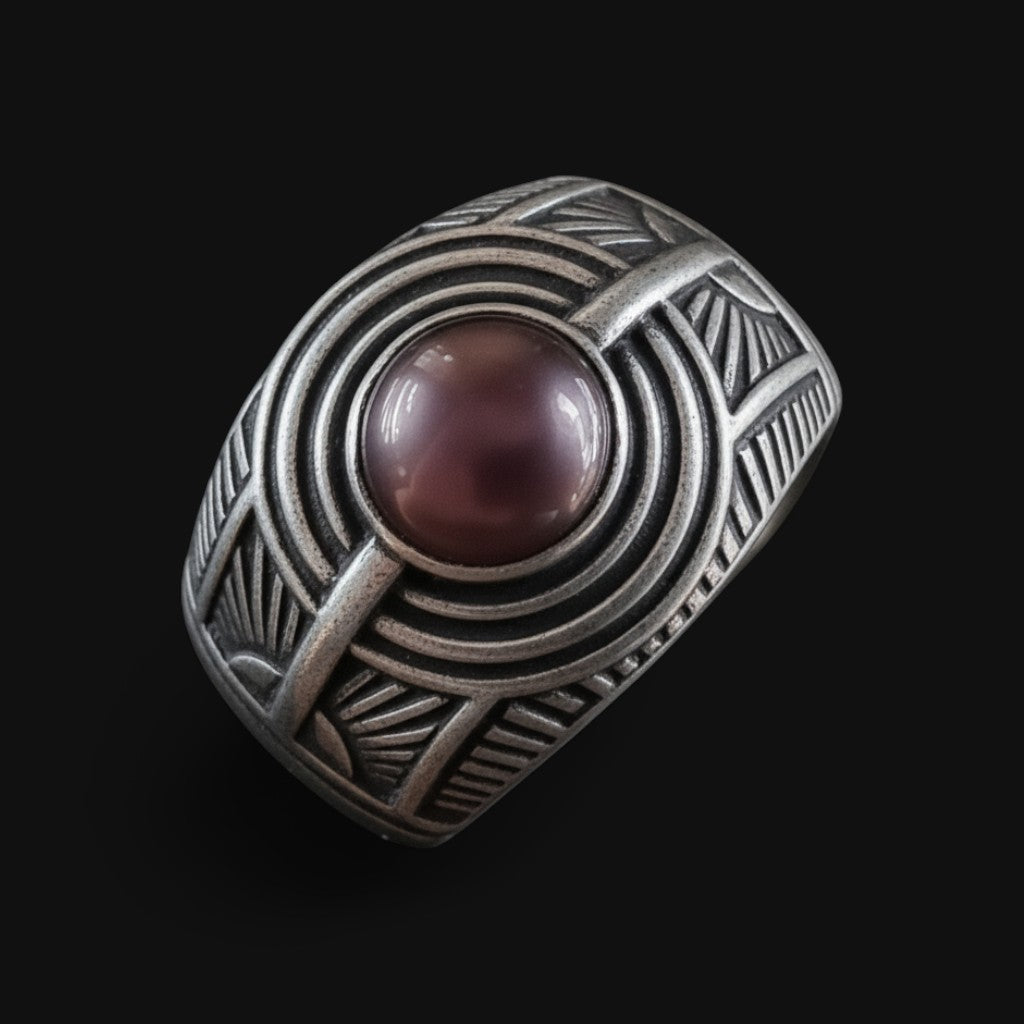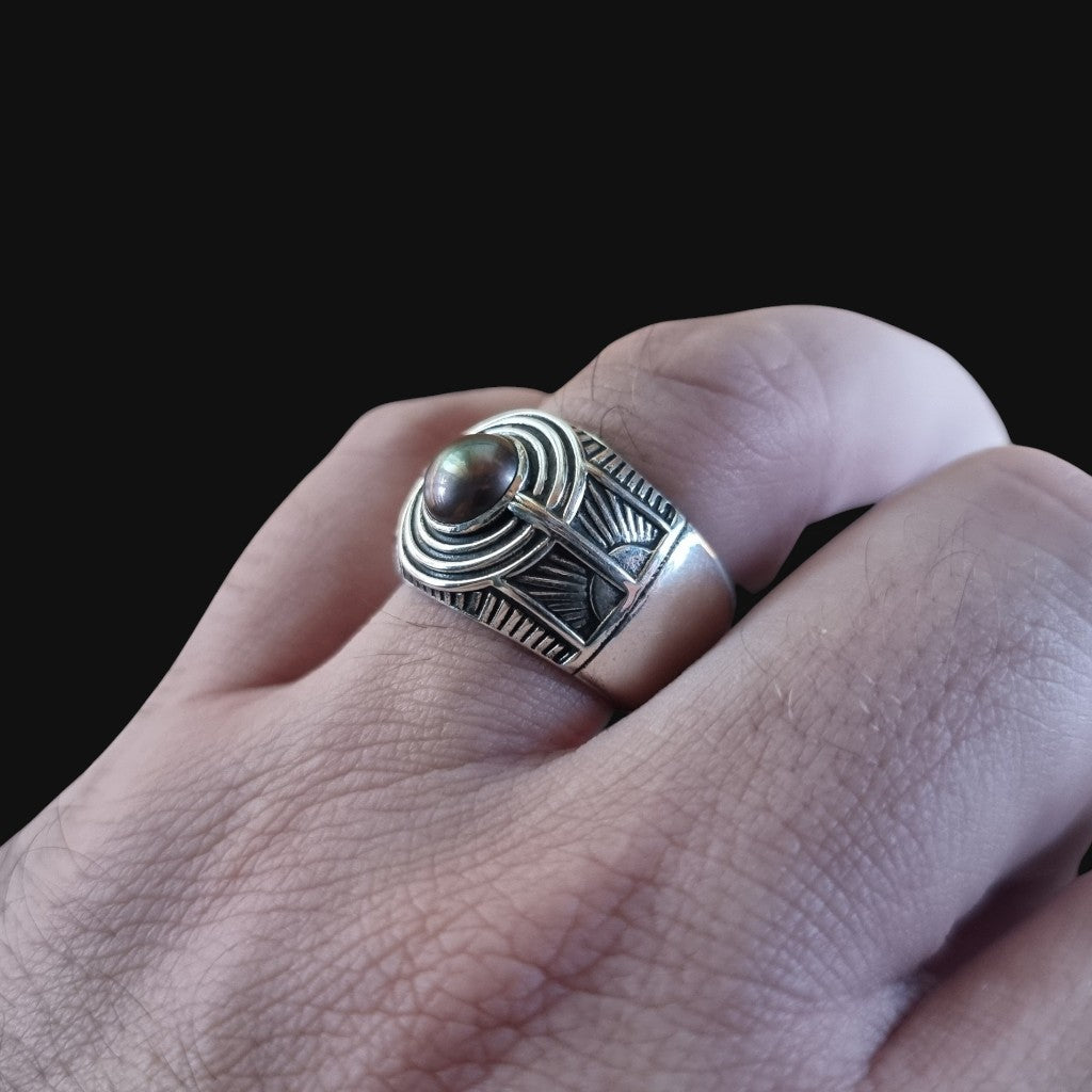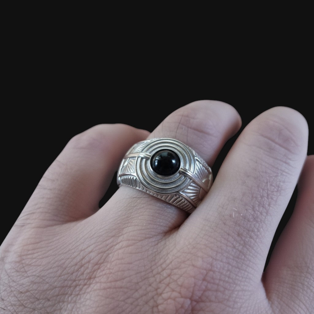 A crown of suns encircles a black, radiant heart. The central stone gathers light and turns it inward, where it becomes quiet weight. Silver arcs rise in slow symmetry, their motion held at the edge of stillness. There is a calm sense of balance here. Darkness lends form to light; light reveals the depth of darkness, together they echo the poise of something primordial, when the first forms began to hold their shape against the void.