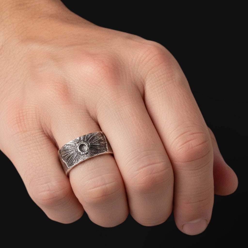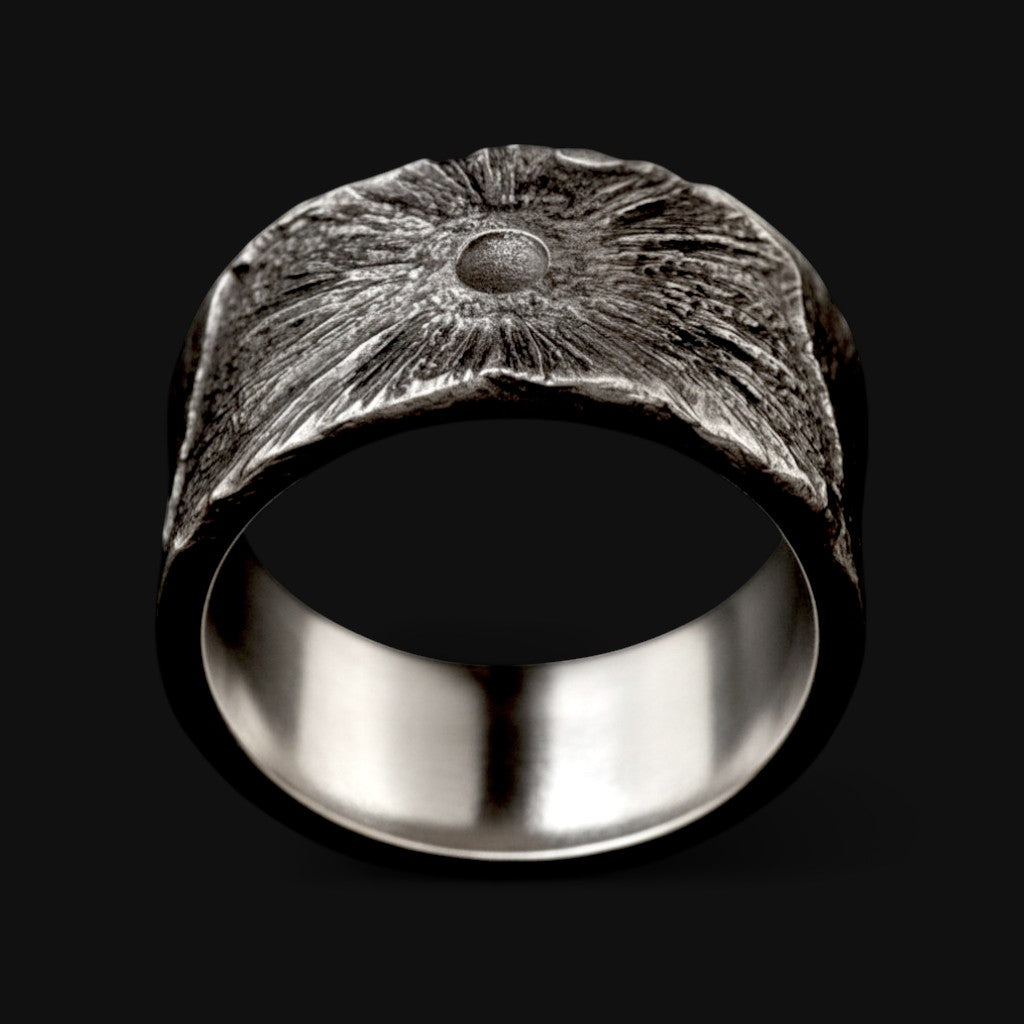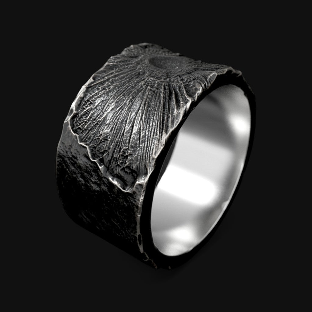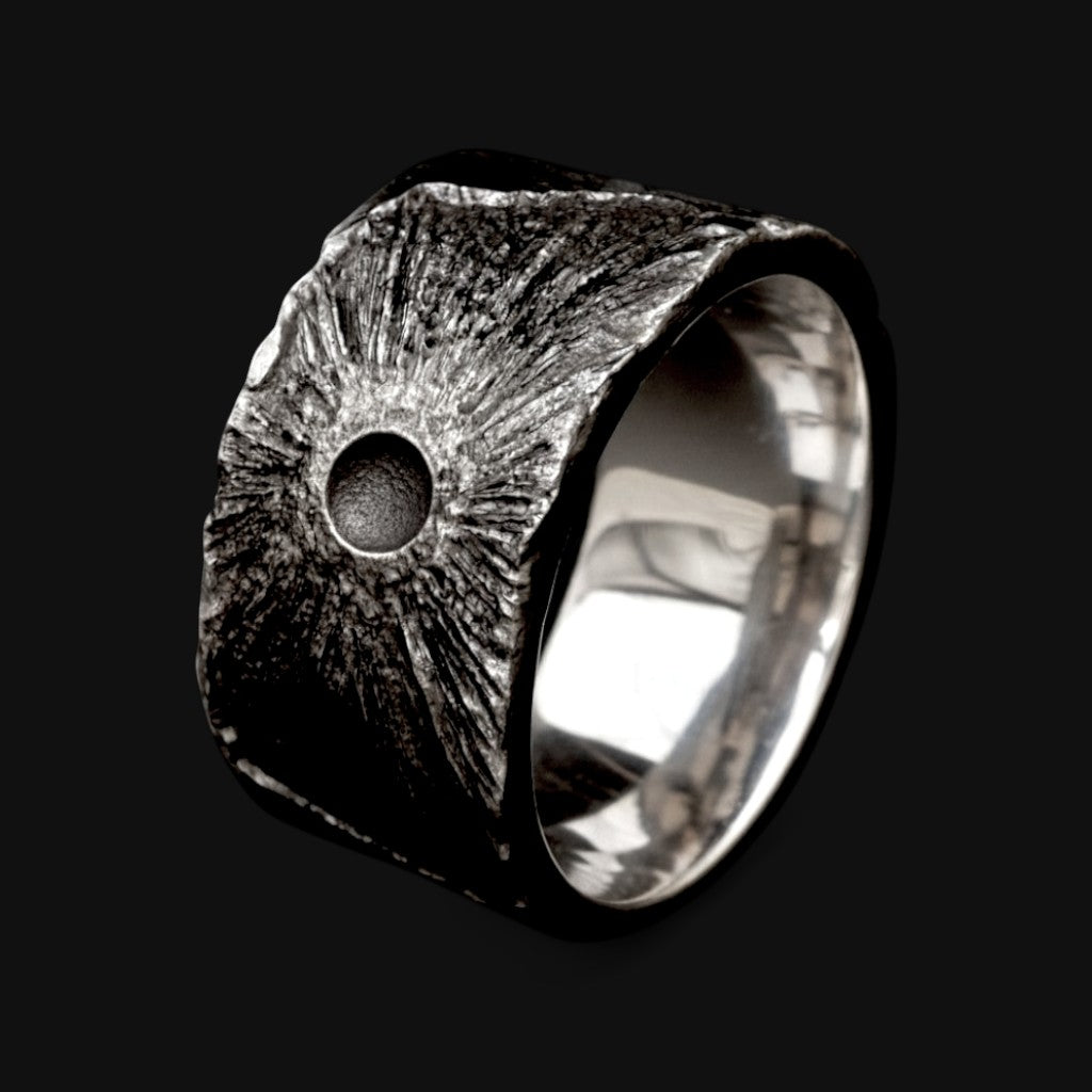 Born from the heart of a dark sun, it is the fire that burns without light. Its molten surface radiates from a blackened core, a slow sunburst shaped by shadow. The metal carries a living intensity, forged where light and darkness meet and continue as one enduring flame.