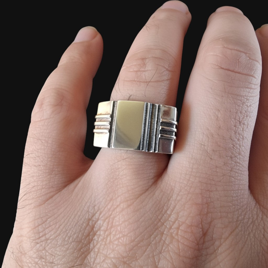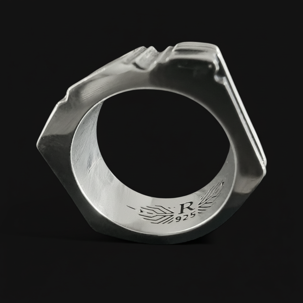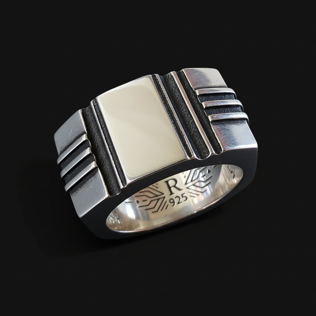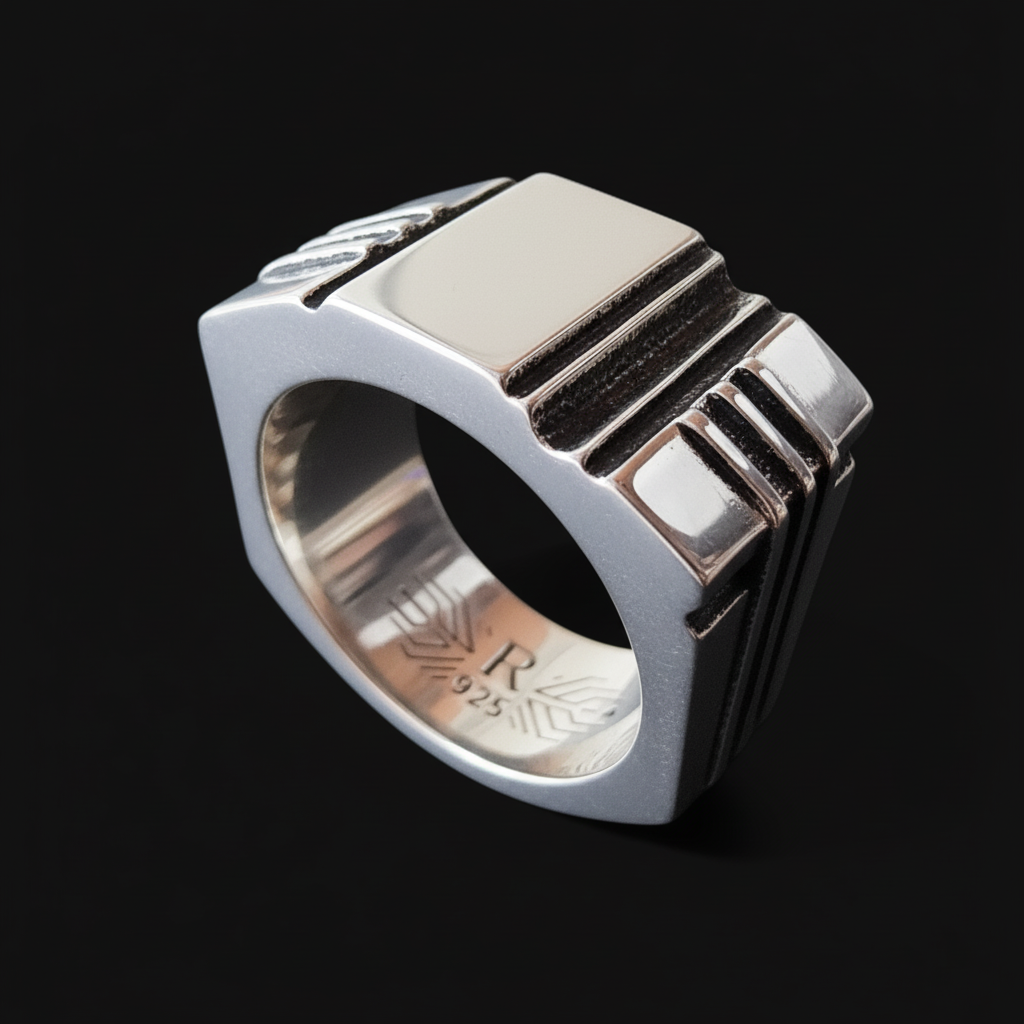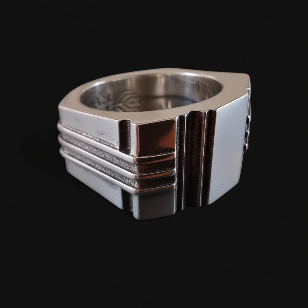 A ring of weight and poise. Its form is architectural—bold, balanced, and precisely grounded. The stepped geometry gives rhythm to its mass, each plane catching light with quiet authority. It feels anchored yet refined, a study in how strength can take shape through order.