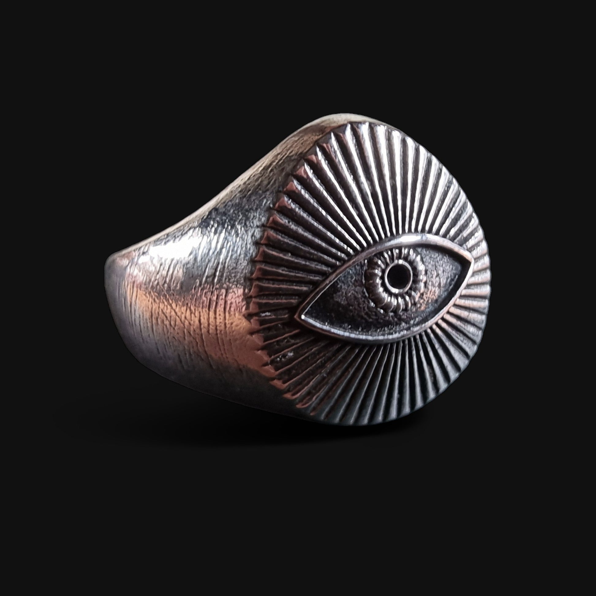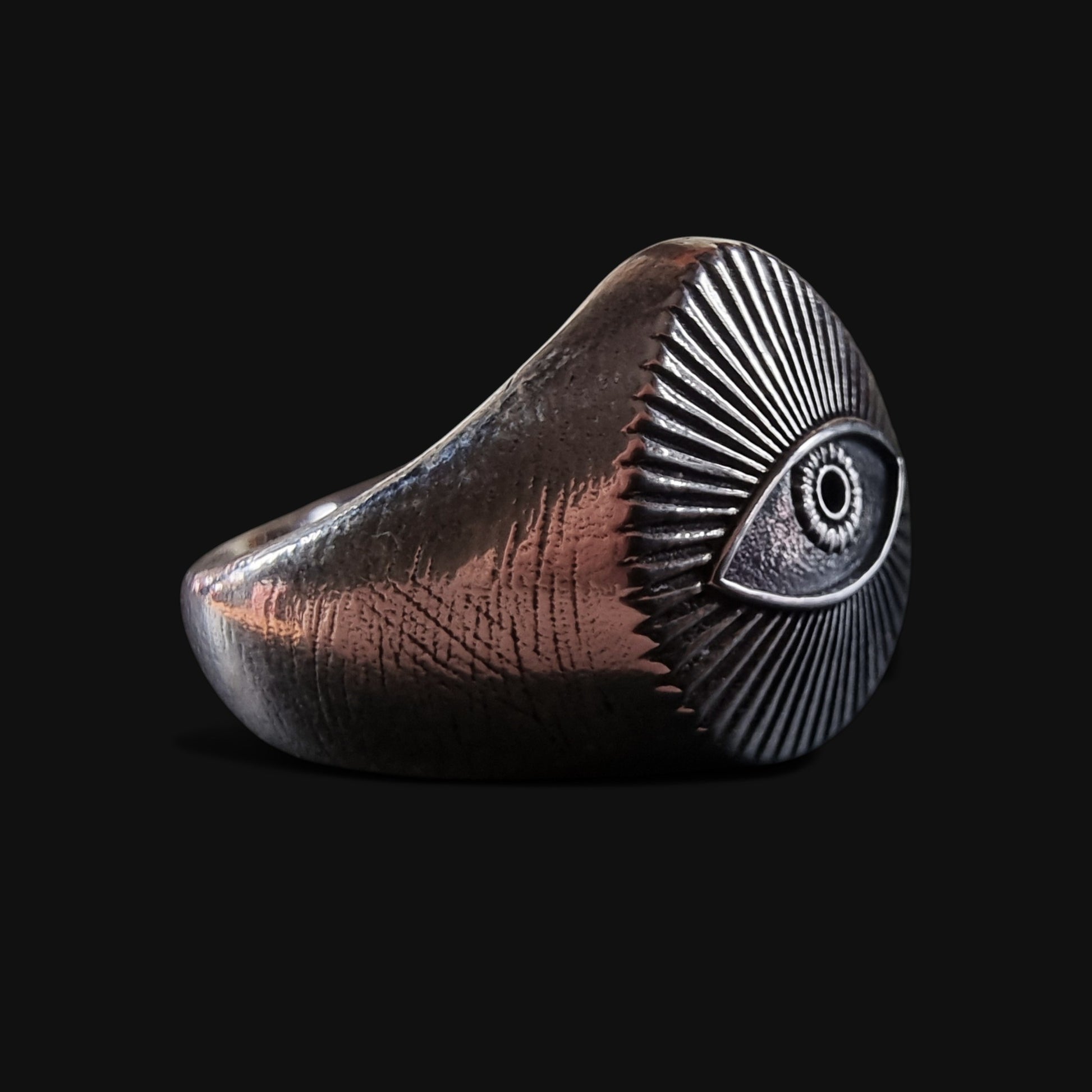 A radiant Eye of Providence carved in silver, this ring symbolises insight, guidance, and unseen protection. The sun-like rays evoke awakening and clarity, an emblem of the self that sees beyond illusion, steady in the face of uncertainty.